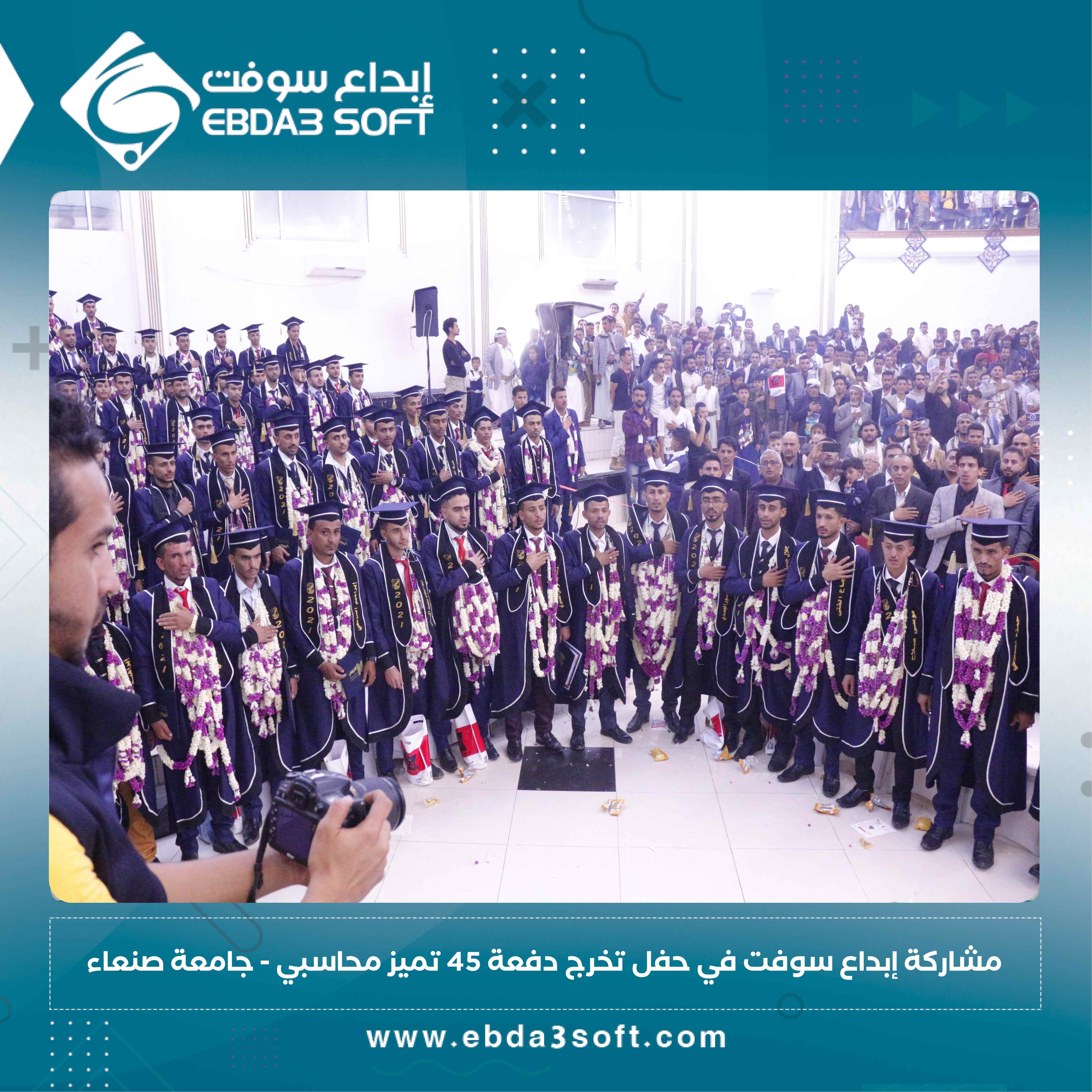 شاركت شركة إبداع سوفت للأنظمة الخاصة يومنا هذا الأحد الموافق 19 سبتمبر، حفل تخرج (تميز محاسبي) الـدفعة الـ 45 كلية التجارة – جامعة صنعاء. وتأتي هذه المشاركة ضمن العديد من المشاركات المجتمعية التي تقدمها شركة إبداع سوفت في سبيل دعمها المعنوي لأبنائنا الطلاب والطالبات. وقد حضر هذا الحفل المهندس أحمد الروحاني ممثلاً عن الشركة والذي نقل بدوره تهاني وتبريكات الشركة لأبنائنا الطلاب والطالبات على قطفهم لثمرة التفوق العلمي الأكاديمي الذي جاء بعد جهود مضنيةٍ طوال سنوات دراسية شاقة، ومرسلاً أمنيات الشركة لهم بحياة مليئة بالنجاح والتقدم والإزدهار، كما نقل إلينا أحمد بعضاً من الصور المعبرة عن إبتهاج وفرحة أبنائنا الطلاب والطالبات بهذا الحفل الكريم الذي أقامته اللجنة المنظمة في قاعة خليجي عشرين الكائنة بحي الجراف.
