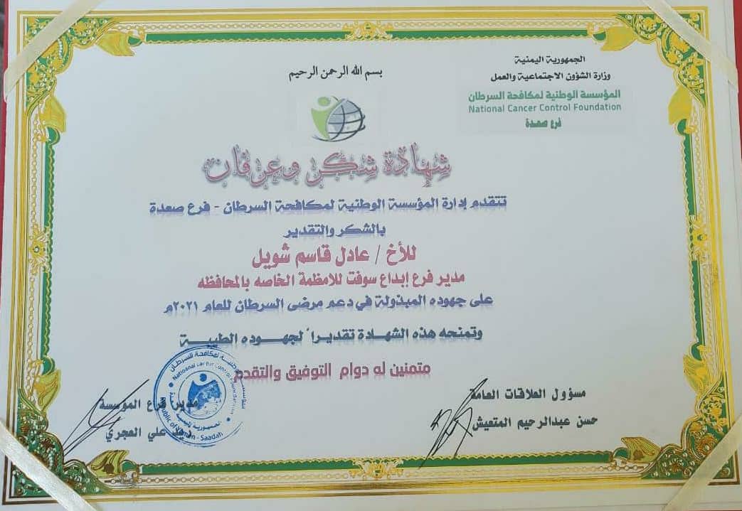 وكعرفان للشركتنا تسلم مدير فرعها بمحافظة صعده م. عادل قاسم شويل هذه الشهاده نيابة عن مدير الشركة التنفيذي