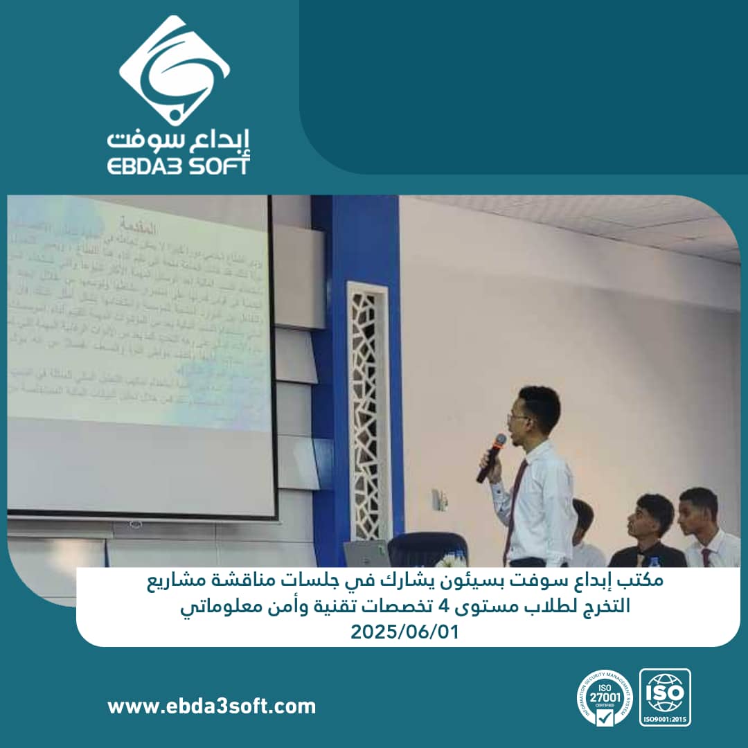 مكتب شركة إبداع سوفت بسيئون يشارك في جلسات مناقشة مشاريع التخرج لطلاب المستوى الرابع تخصصات ( تقنية معلومات وعلوم حاسوب وأمن المعلومات )