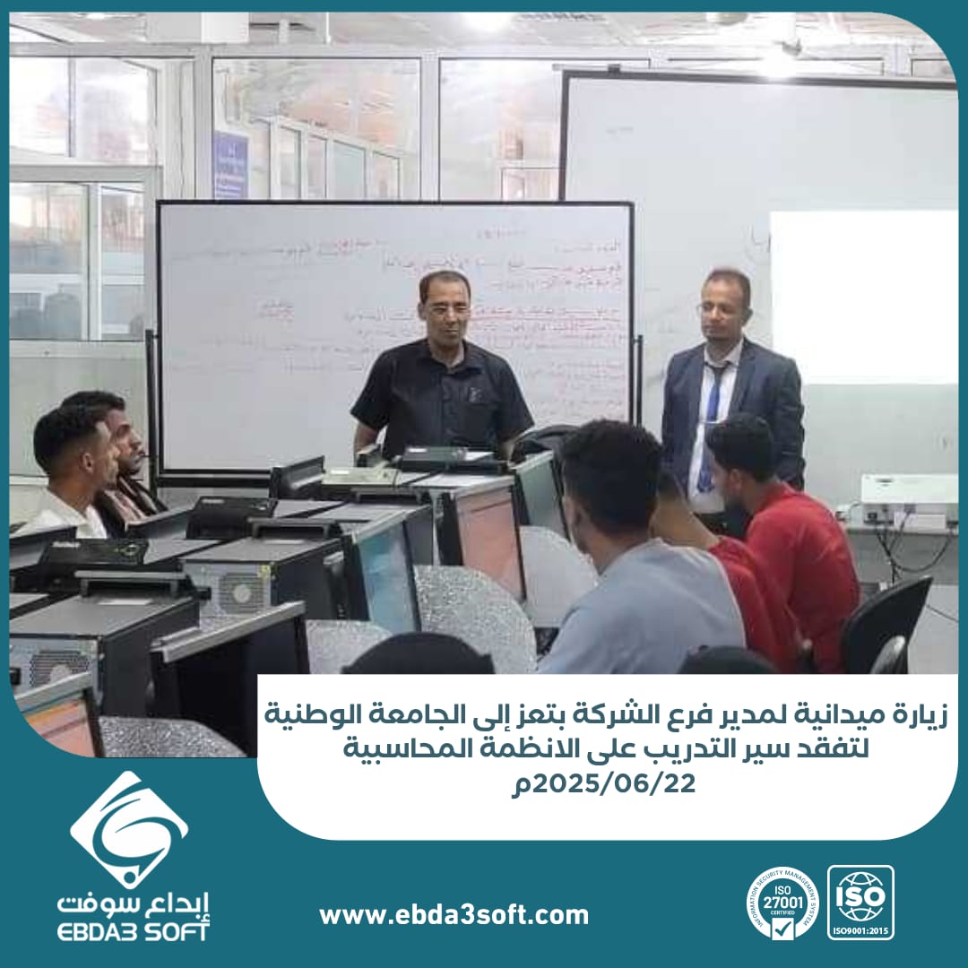 في إطار اهتمام شركة “إبداع سوفت” بتعزيز العلاقة مع المؤسسات التعليمية وتقديم الدعم المباشر للمتدربين، قام المهندس طه الشريحي – مدير فرع الشركة بمحافظة تعز – بزيارة إلى الجامعة الوطنية لتفقد سير التدريب على أنظمتنا المحاسبية والإدارية حيث التقى بمجموعة من الخريجين أثناء مشاركتهم في الدورات التدريبية المنعقدة حاليًا في الجامعة واستمع منهم.