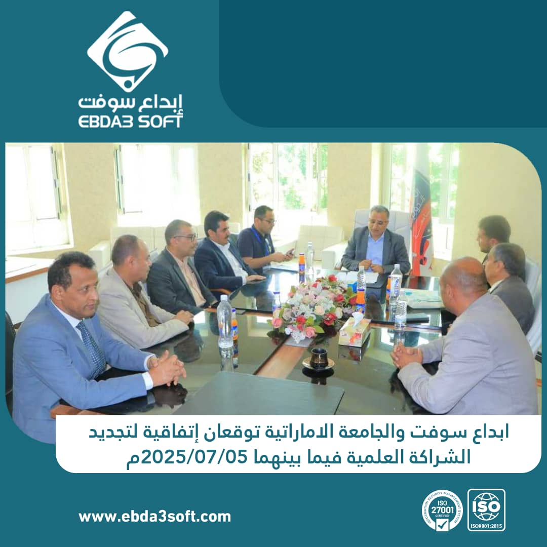 وقعت ابداع سوفت عبر مكتبها التدريبي صباح اليوم السبت الموافق 05 يوليو 2025م عقد لتجديد الشراكة العلمية مع الجامعة الاماراتية بمقر الجامعة الكائن في حدة فج عطان – شارع بيروت بأمانة العاصمة.