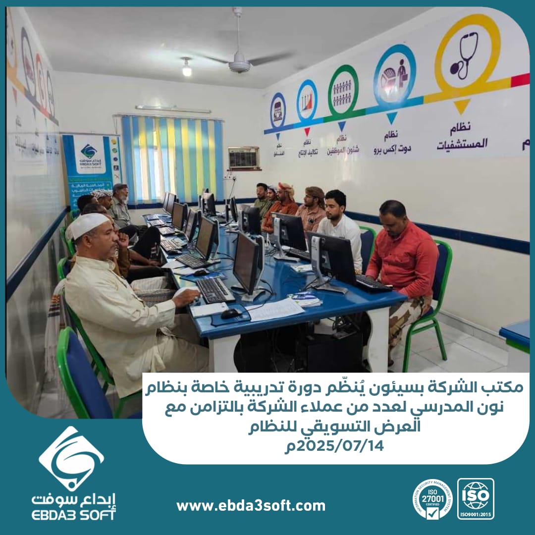 اقيمت صباح اليوم الاثنين الموافق 14 يوليو 2025م بمكتب الشركة في سيئون – حضرموت دورة تدريبية خاصة بنظام إدارة المدارس، وذلك بالتزامن مع الحملة التسويقية للنظام التي اطلقتها الشركة في يونيو وتستمر حتى اغسطس القادم وذلك بهدف الترويج لأحدث ميزات النظام.