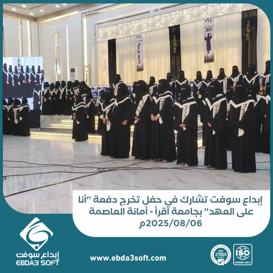 شاركت إبداع سوفت في حفل تخرج دفعة “إنا على العهد” لطالبات جامعة اقرأ للعلوم والتكنولوجيا، والذي أقيم يوم الأحد الموافق 6 أغسطس 2025م في قاعة القصر الأبيض – الجراف، بحضور نخبة من الشخصيات الأكاديمية والإدارية.