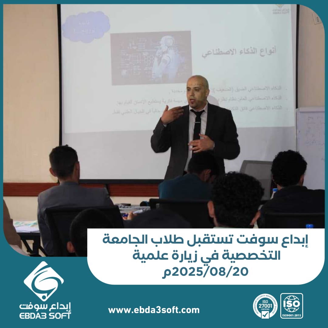استقبلت إبداع سوفت صباح يوم الأربعاء الموافق 20 أغسطس 2025م، طلاب كلية الهندسة وتكنولوجيا المعلومات – تخصص تقنية المعلومات بالجامعة التخصصية، وذلك في إطار التعاون الأكاديمي والربط بين الجانب النظري والتطبيقي.