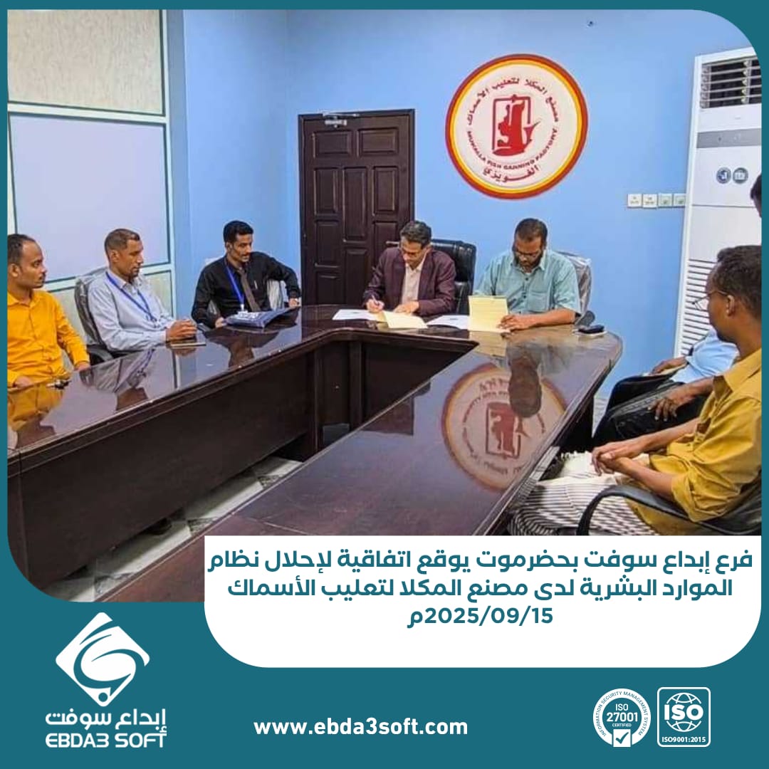 في خطوة جديدة نحو تعزيز التحول الرقمي في القطاع الصناعي، وقّعت إبداع سوفت للأنظمة الخاصة عبر فرعها بحضرموت اتفاقية لإحلال نظام الموارد البشرية بمصنع المكلا لتعليب الأسماك وذلك صباح يومنا هذا الاثنين الموافق 15 سبتمبر 2025م.