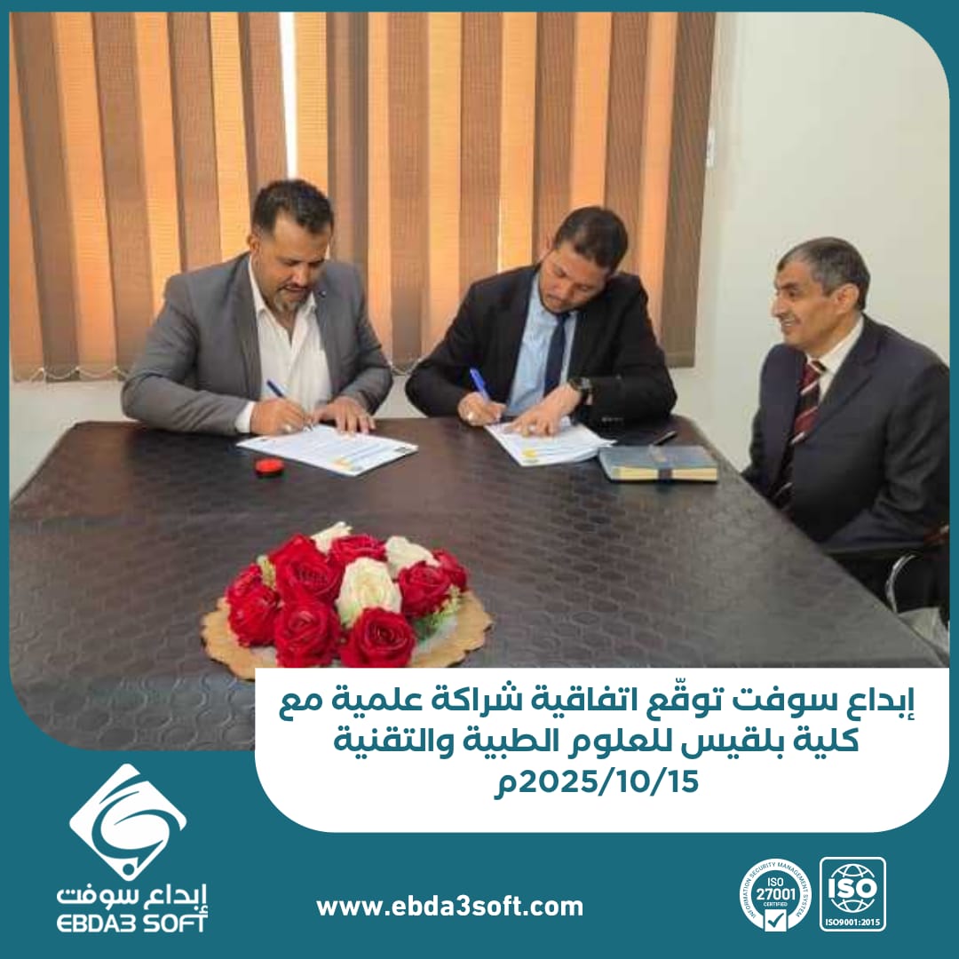 وقّعت إبداع سوفت للأنظمة الخاصة صباح اليوم اتفاقية شراكة علمية مع كلية بلقيس للعلوم الطبية والتقنية بمقر الكلية في شارع المقالح – صنعاء، بهدف تعزيز التعاون في مجال التدريب والتأهيل التقني للطلاب.