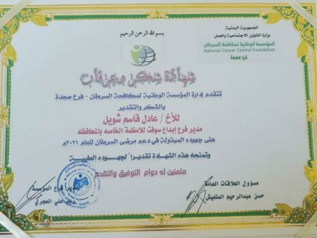 المؤسسة الوطنية لمكافحة السرطان التابعة لوزارة الشؤون الاجتماعية والعمل تشيد بالجهود التي بذلتها الشركة في دعم مرضى السرطان أجارنا الله واياكم منه وكعرفان للشركتنا تسلم مدير فرعها بمحافظة صعده م. عادل قاسم شويل هذه الشهاده نيابة عن مدير الشركة التنفيذي