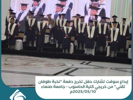 الإثنين | 13 مايو 2025 التسويق الإلكتروني شاركت شركة ابداع سوفت صباح يومنا هذا الثلاثاء الموافق 2025/05/13م احتفالية تخرج طالبات من كلية الحاسوب بجامعة صنعاء الذي أقيم بصالة رولكس الكائنة منطقة صرف وضم الاحتفال 30 خريجة من كلية الحاسوب تخصص تقنية المعلومات وتخلله عدد من الفقرات الفنية والفكلورية وكلمة للخريجات ألقتها الطالبة آيه ابراهيم حسان والتي رحبت عبرها بالحاضرين جميعا وهنأت زميلاتها الخريجات كما قدمت الشكر والتقدير لاولياء الامور والجهات المانحة التي كان لشركة ابداع سوفت حضورا بارزًا بينها. وقد [...]